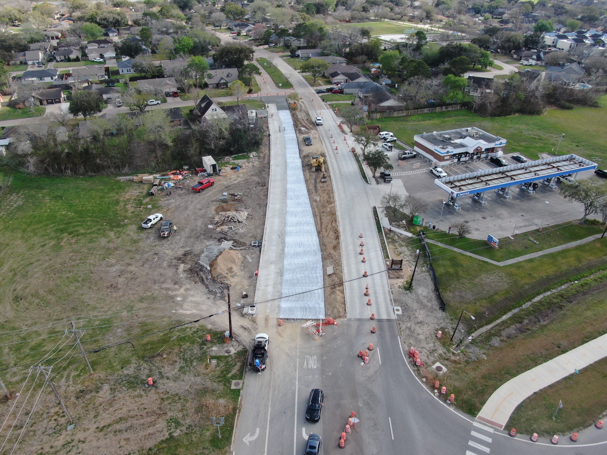 This project is designed to prevent the drainage ditch along SH96 from overflowing into the neighborhood during heavy rainfall events. This is achieved by raising the roadway, including the storm sewer piping, at the entrance of the neighborhood.