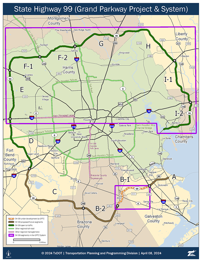 State Highway 99 (the Grand Parkway) is a proposed 180-mile circumferential highway traversing seven counties in the Greater Houston area. Conceptualized in the early 1960s, it is divided into 12 segments, 8 of which are already open to traffic.